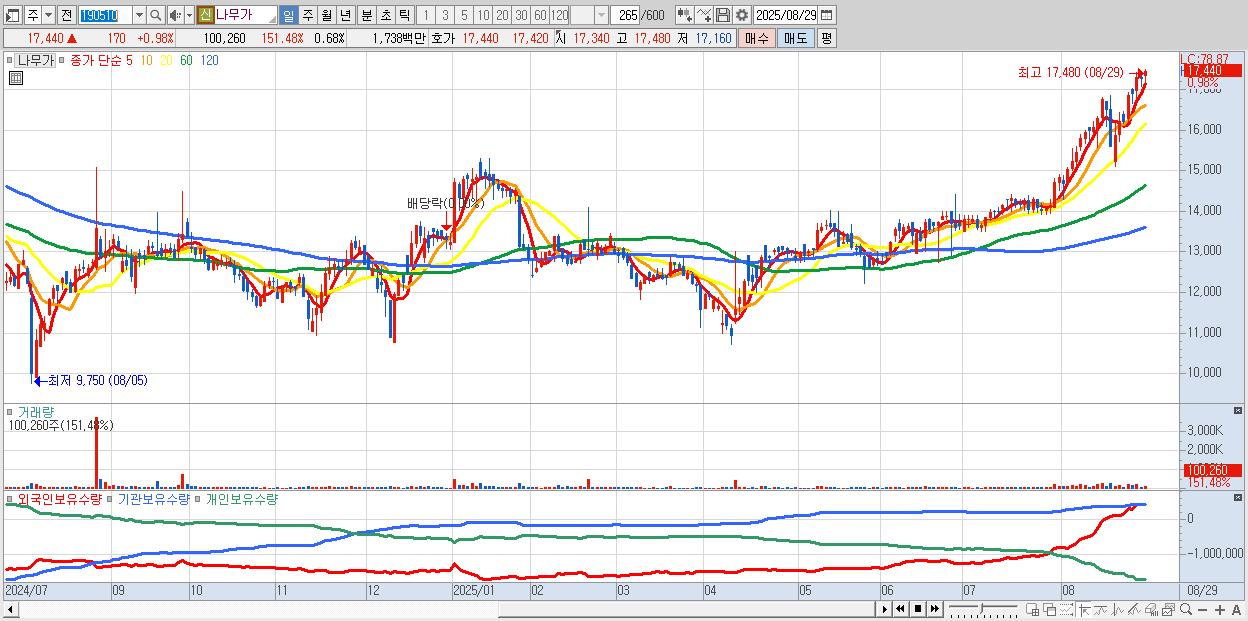 - 나무가 (17,440원 ▲ 0.98% , 시총: 2,564억, 거래량: 100,260, 거래대금:17억, KOSDAQ)
