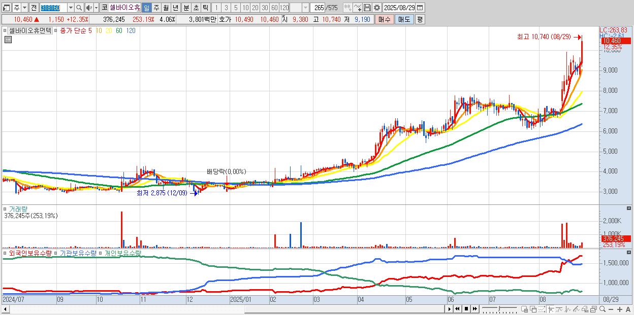 - 셀바이오휴먼텍 (10,460원 ▲ 12.35% , 시총: 969억, 거래량: 376,245, 거래대금:38억, KOSDAQ)