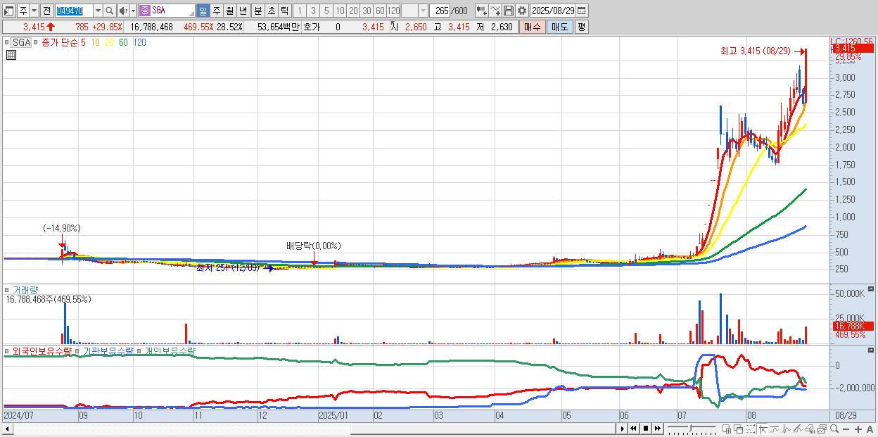 - SGA (3,415원 ▲ 29.85% , 시총: 2,010억, 거래량: 16,788,468, 거래대금:537억, KOSDAQ)