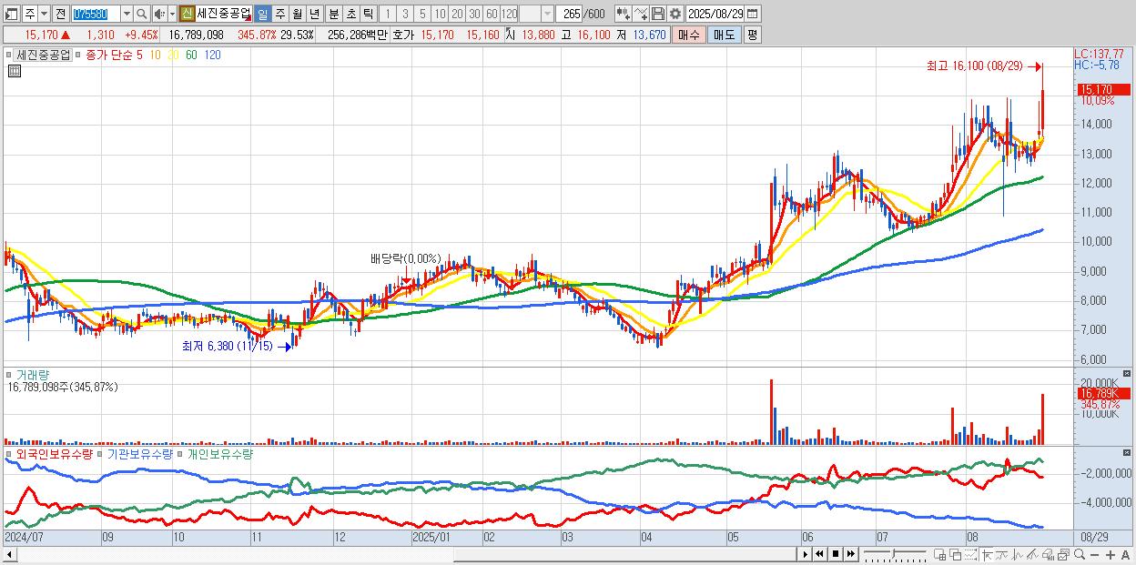 - 세진중공업 (15,200원 ▲ 9.67% , 시총: 8,641억, 거래량: 8,968,995, 거래대금:1,370억, KOSPI)
