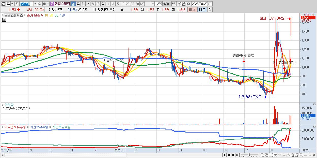 - 동일스틸럭스 (1,554원 ▲ 29.93% , 시총: 406억, 거래량: 7,824,676, 거래대금:113억, KOSDAQ)