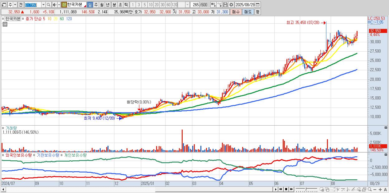 - 한국카본 (32,900원 ▲ 4.94% , 시총: 17,078억, 거래량: 712,665, 거래대금:231억, KOSPI)