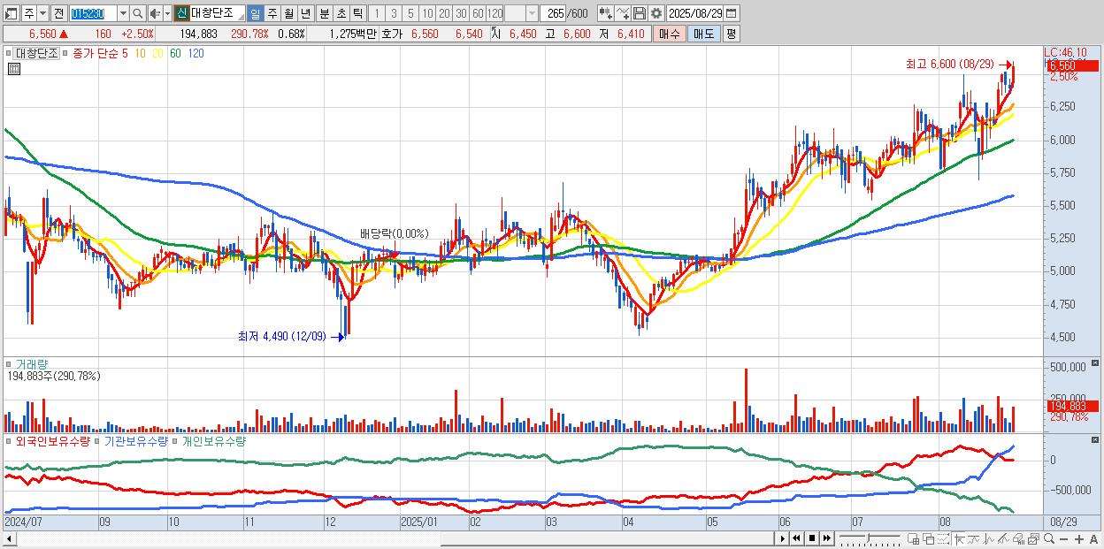 - 대창단조 (6,560원 ▲ 2.5% , 시총: 1,874억, 거래량: 194,883, 거래대금:13억, KOSPI)