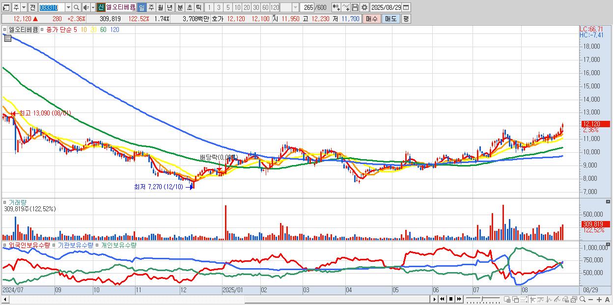 - 엘오티베큠 (12,120원 ▲ 2.36% , 시총: 2,159억, 거래량: 309,819, 거래대금:37억, KOSDAQ)