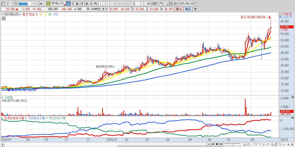 - SNT에너지 (61,400원 ▲ 5.68% , 시총: 12,698억, 거래량: 507,090, 거래대금:318억, KOSPI)