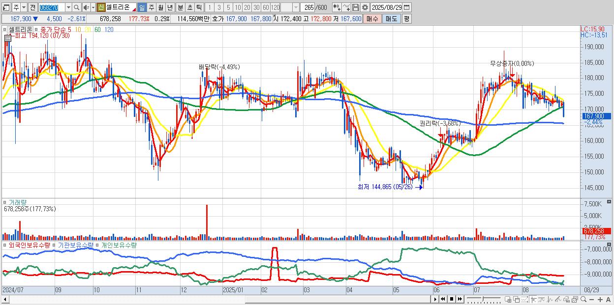 - 셀트리온 (167,600원 ▼ -2.78% , 시총: 387,054억, 거래량: 519,650, 거래대금:877억)