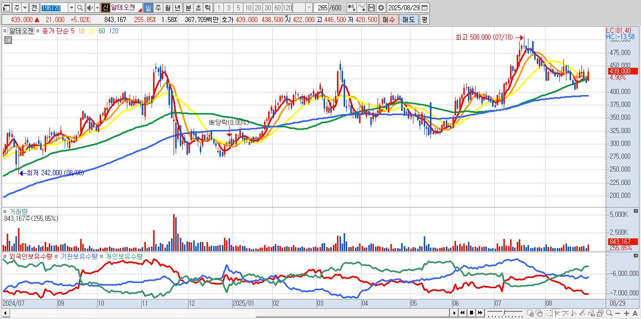 - 알테오젠 (438,500원 ▲ 4.9% , 시총: 234,444억, 거래량: 452,458, 거래대금:1,979억)