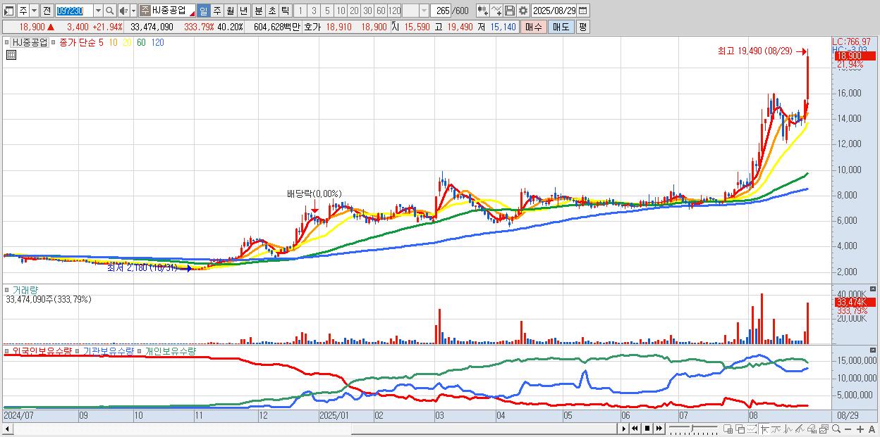 - HJ중공업 (18,880원 ▲ 21.81% , 시총: 15,722억, 거래량: 17,386,504, 거래대금:3,170억)