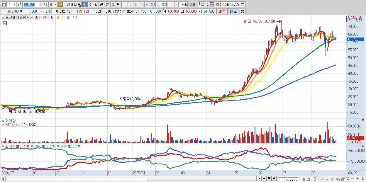 - 두산에너빌리티 (61,700원 ▼ -1.91% , 시총: 395,226억, 거래량: 4,054,284, 거래대금:2,518억)