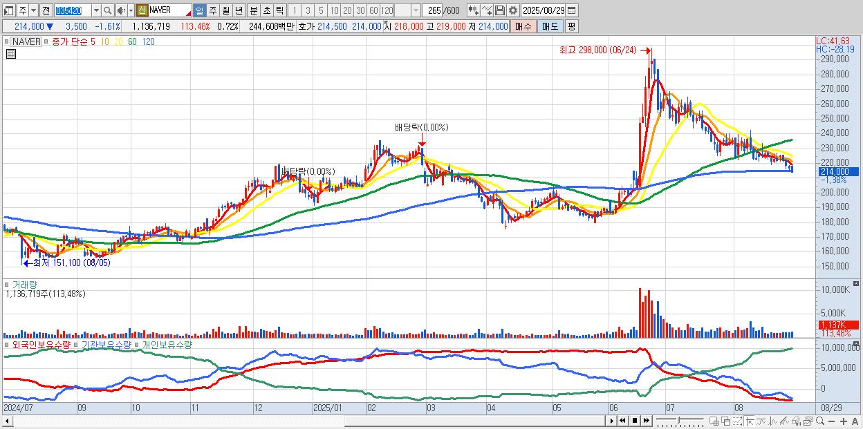 - NAVER (214,500원 ▼ -1.38% , 시총: 336,449억, 거래량: 750,586, 거래대금:1,614억)