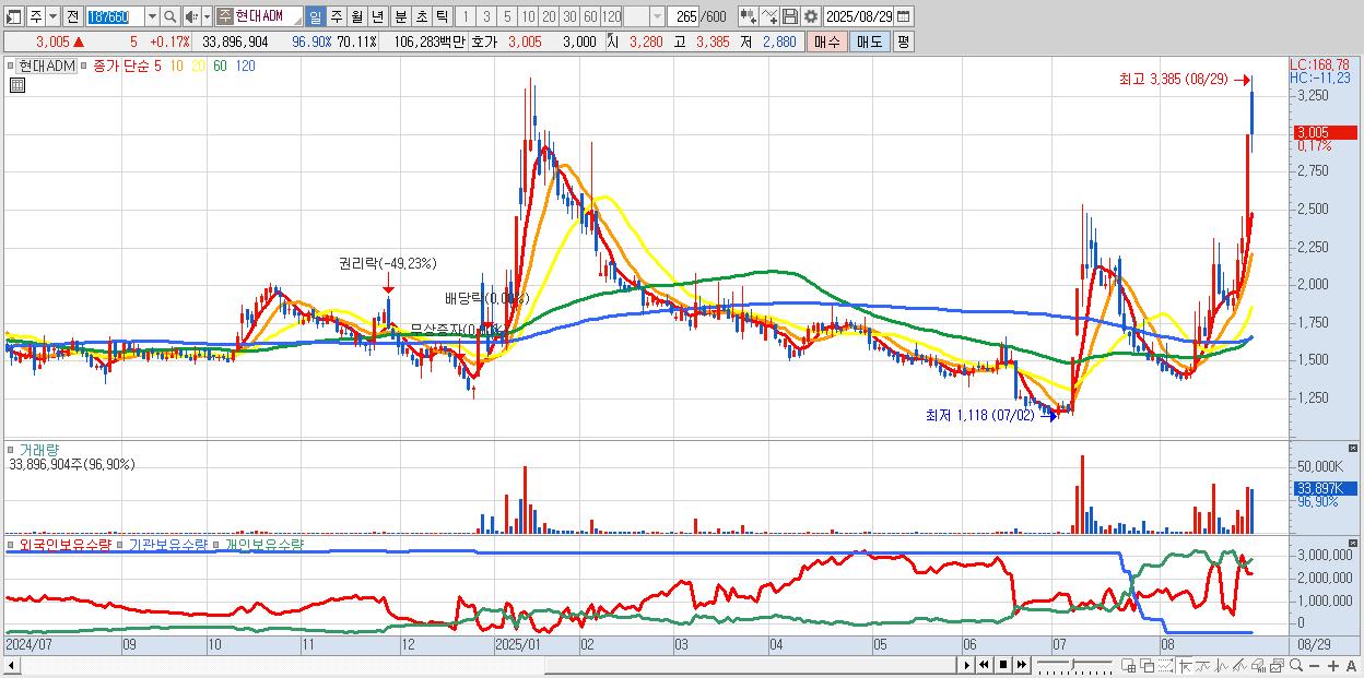 - 현대ADM (3,005원 ▲ 0.17% , 시총: 1,453억, 거래량: 33,896,904, 거래대금:1,063억)