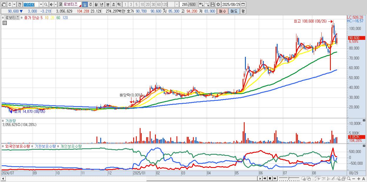 - 로보티즈 (90,900원 ▼ -2.88% , 시총: 12,017억, 거래량: 1,385,250, 거래대금:1,253억)
