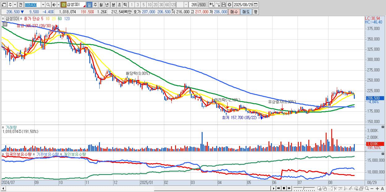 - 삼성SDI (207,000원 ▼ -4.17% , 시총: 166,812억, 거래량: 619,884, 거래대금:1,292억)