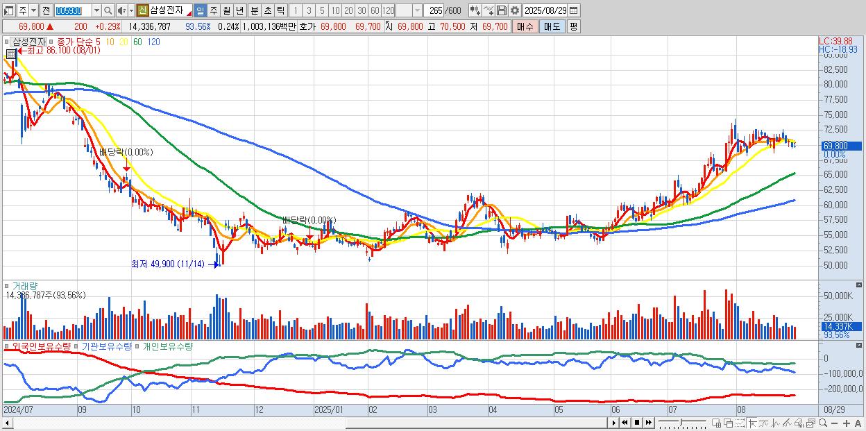 1.삼성전자 69,700원 ▲ 0.14% (KOSPI, 005930)