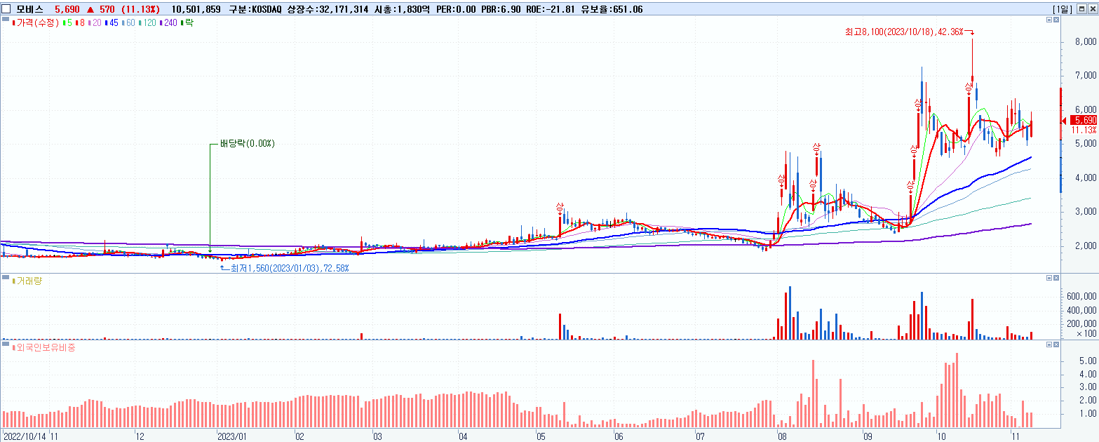 - 모비스 (5,690원 ▲ 11.13% , 시총: 1,831억, 거래량: 10,631,501, 거래대금:601억)