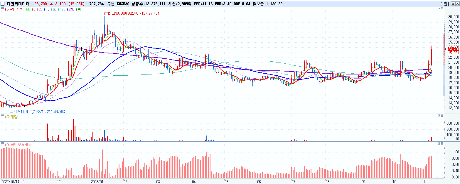 - 디앤씨미디어 (23,700원 ▲ 15.05% , 시총: 2,909억, 거래량: 719,822, 거래대금:168억)