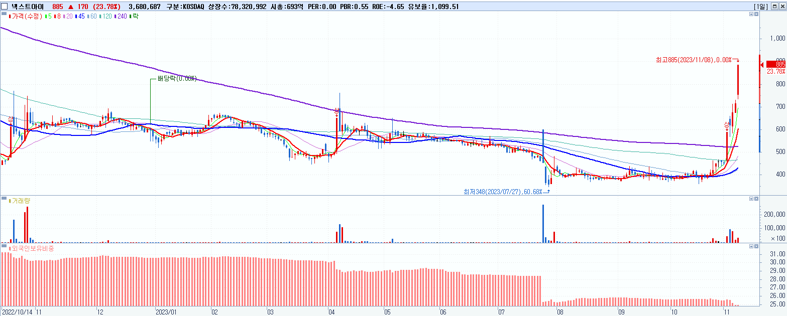 - 넥스트아이 (885원 ▲ 23.78% , 시총: 693억, 거래량: 4,054,791, 거래대금:33억)