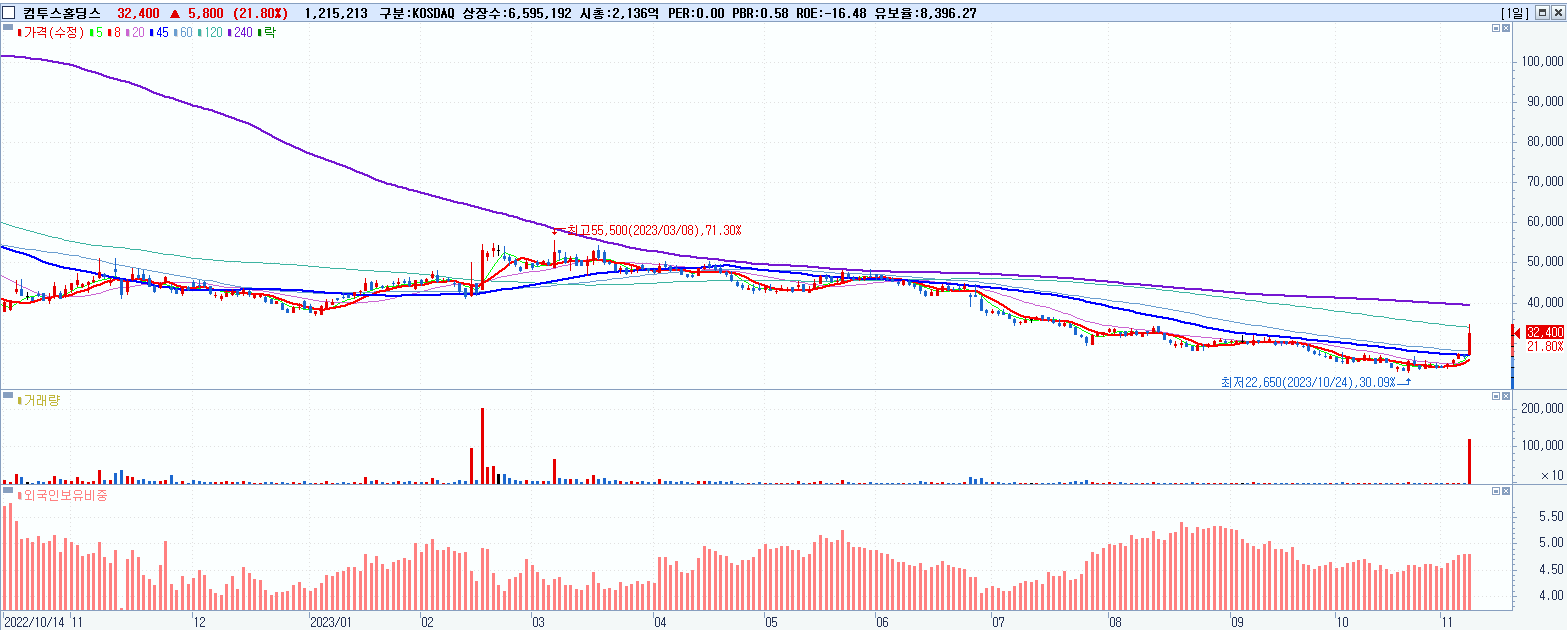 - 컴투스홀딩스 (32,400원 ▲ 21.8% , 시총: 2,137억, 거래량: 1,238,788, 거래대금:400억)