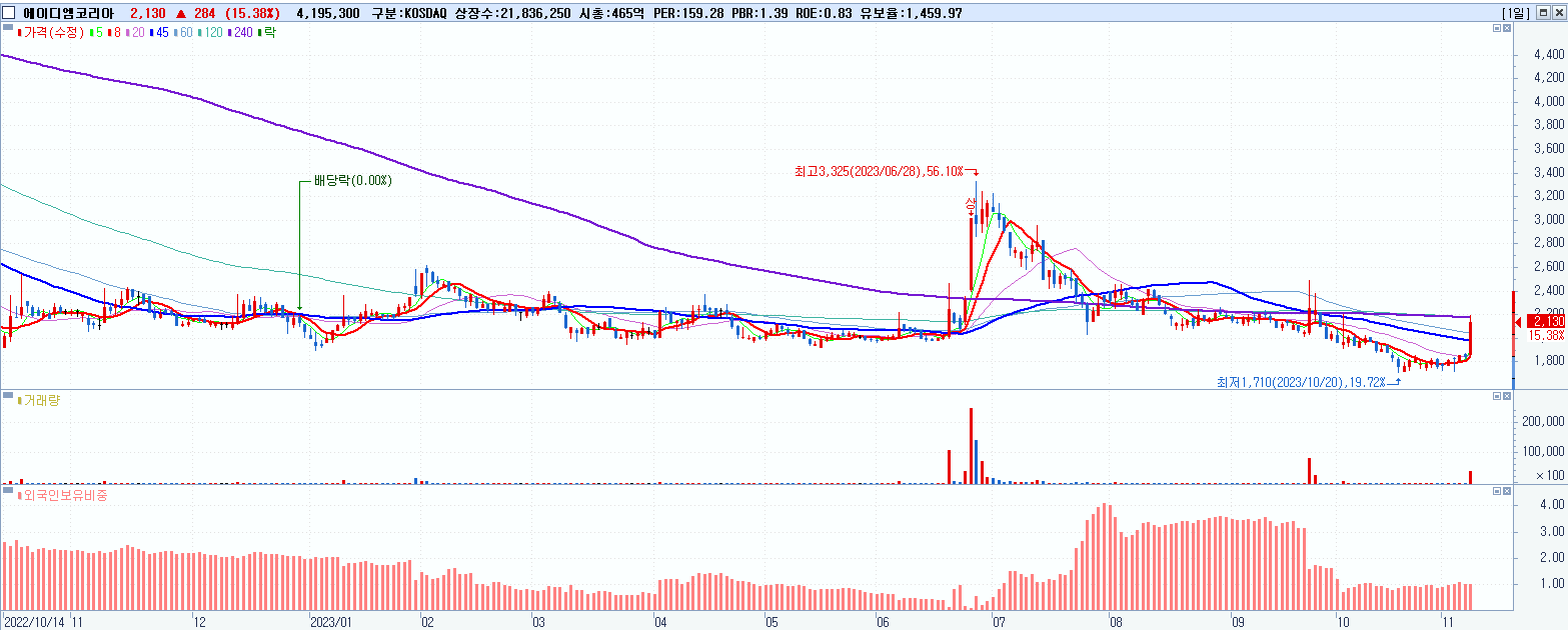- 에이디엠코리아 (2,130원 ▲ 15.38% , 시총: 465억, 거래량: 4,556,149, 거래대금:96억)
