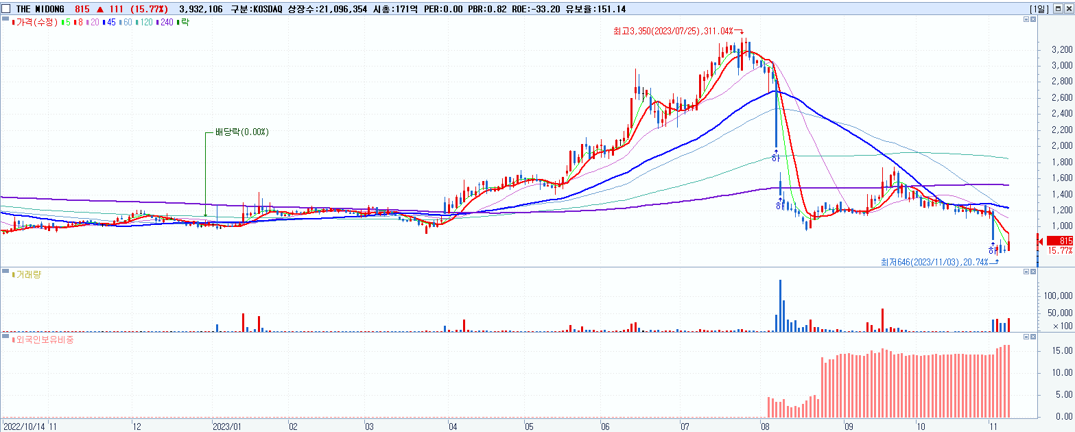 - THE MIDONG (815원 ▲ 15.77% , 시총: 172억, 거래량: 3,947,347, 거래대금:33억)