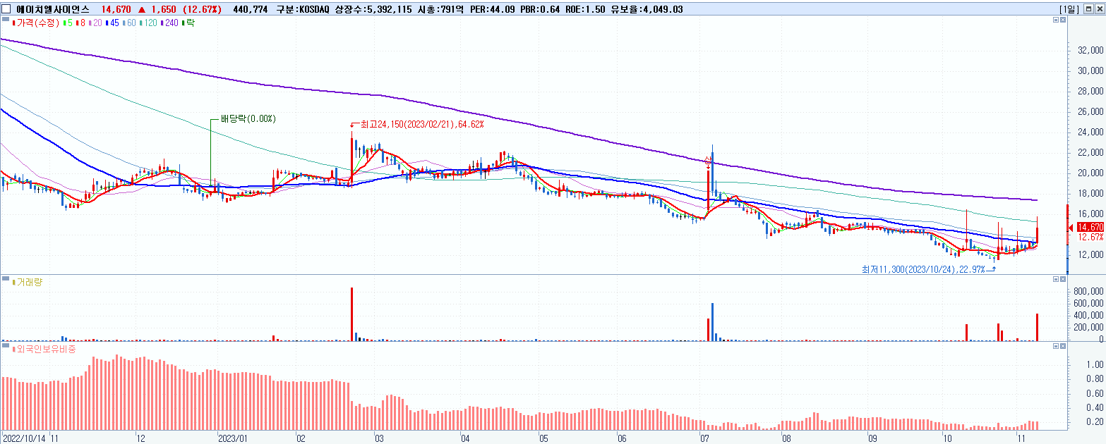 - 에이치엘사이언스 (14,670원 ▲ 12.67% , 시총: 791억, 거래량: 442,244, 거래대금:67억)