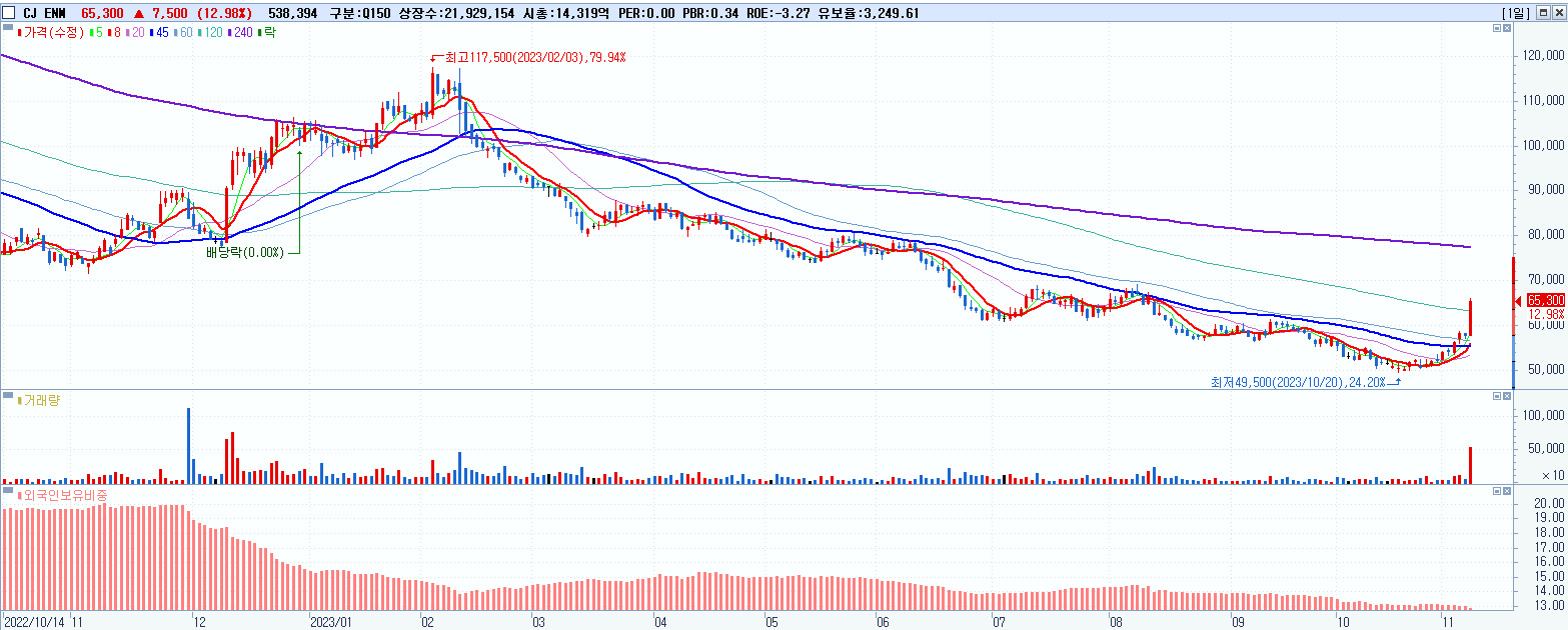 - CJ ENM (65,300원 ▲ 12.98% , 시총: 14,320억, 거래량: 546,231, 거래대금:343억)