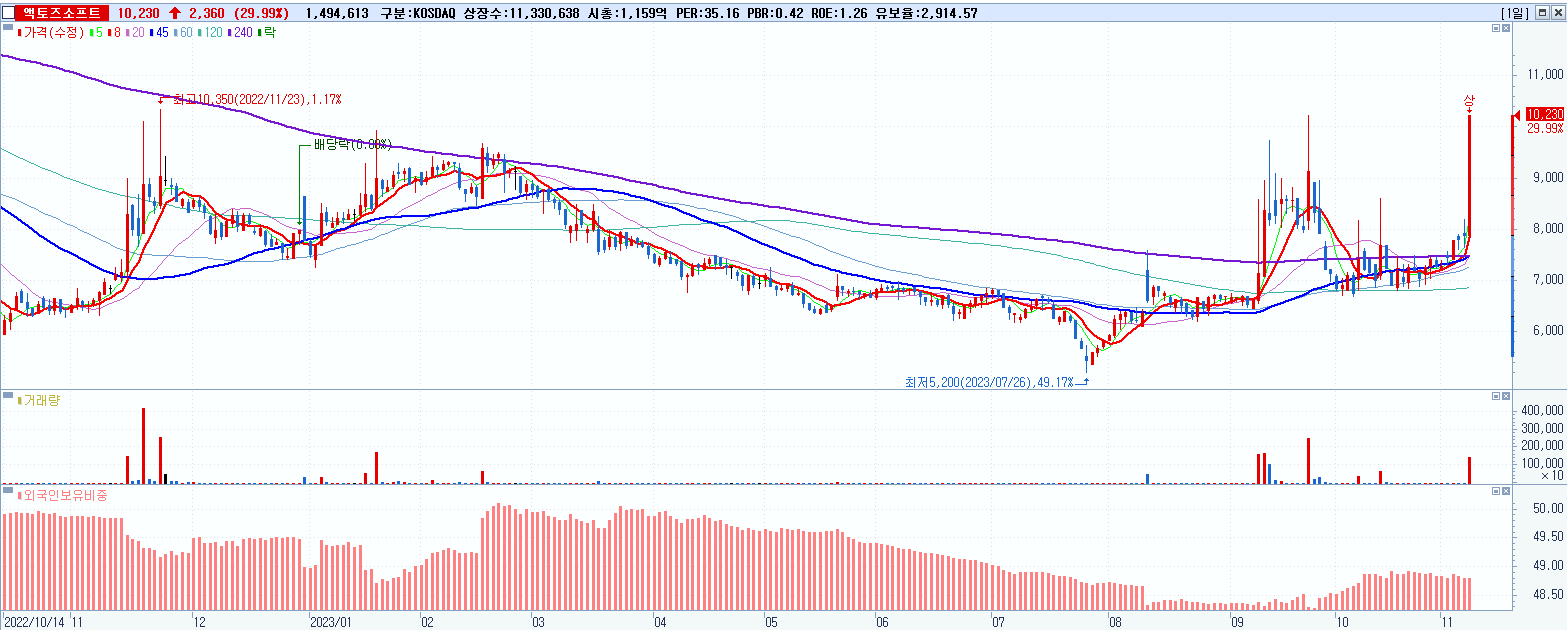 - 액토즈소프트 (10,230원 ▲ 29.99% , 시총: 1,159억, 거래량: 1,494,666, 거래대금:143억)