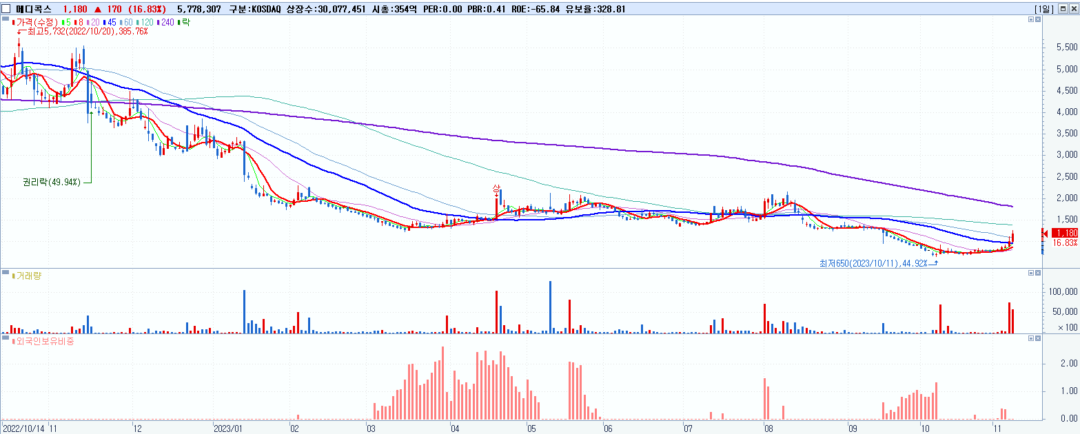 - 메디콕스 (1,180원 ▲ 16.83% , 시총: 355억, 거래량: 5,812,457, 거래대금:67억)