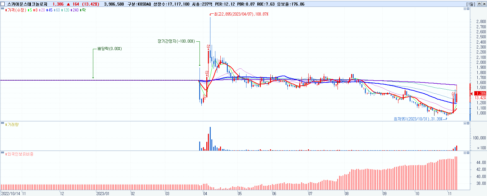 - 스카이문스테크놀로지 (1,386원 ▲ 13.42% , 시총: 237억, 거래량: 4,001,076, 거래대금:56억)
