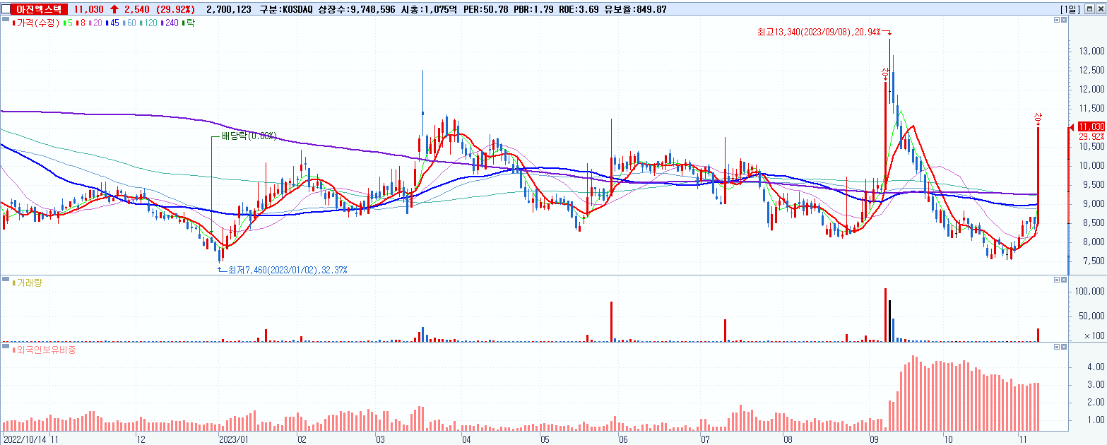 2.아진엑스텍 11,030원 ▲ 29.92% (KOSDAQ, 059120)