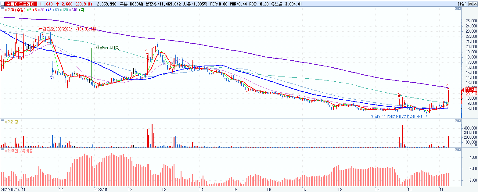 - 위메이드플레이 (11,640원 ▲ 29.91% , 시총: 1,335억, 거래량: 2,366,680, 거래대금:263억)