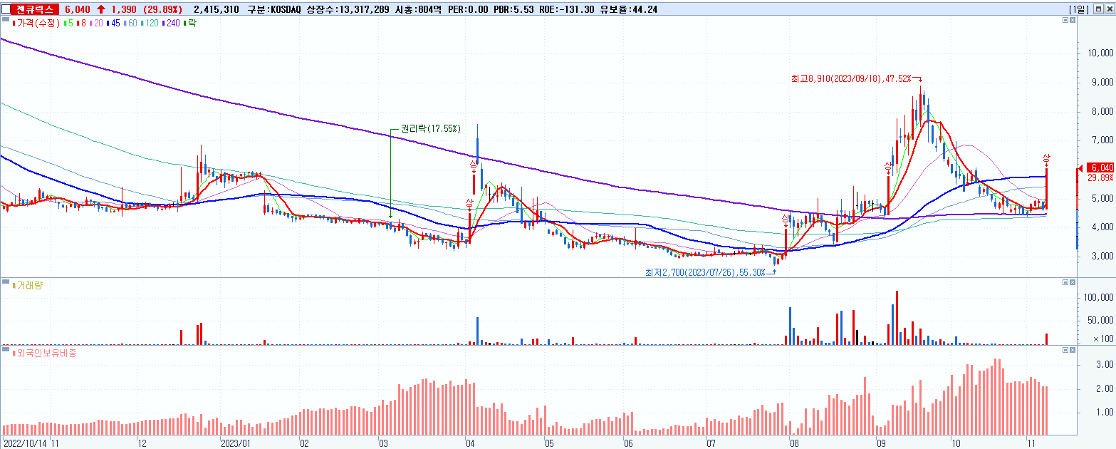 - 젠큐릭스 (6,040원 ▲ 29.89% , 시총: 804억, 거래량: 2,415,473, 거래대금:141억)