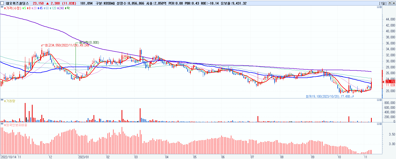 29.네오위즈홀딩스 23,150원 ▲ 11.03% (KOSDAQ, 042420)