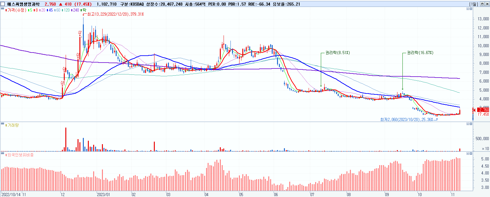 - 에스씨엠생명과학 (2,760원 ▲ 17.45% , 시총: 565억, 거래량: 1,107,243, 거래대금:29억)