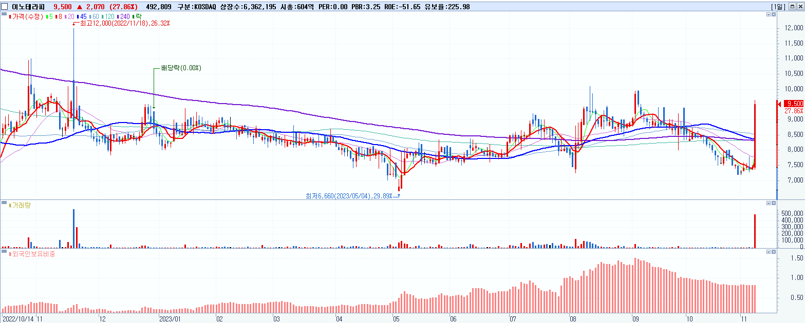 - 이노테라피 (9,500원 ▲ 27.86% , 시총: 604억, 거래량: 499,983, 거래대금:46억)