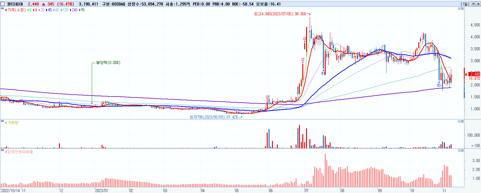 - 퀀타피아 (2,440원 ▲ 16.47% , 시총: 1,296억, 거래량: 3,204,102, 거래대금:76억)