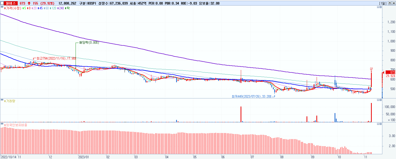 - 윌비스 (673원 ▲ 29.92% , 시총: 452억, 거래량: 12,980,581, 거래대금:83억)