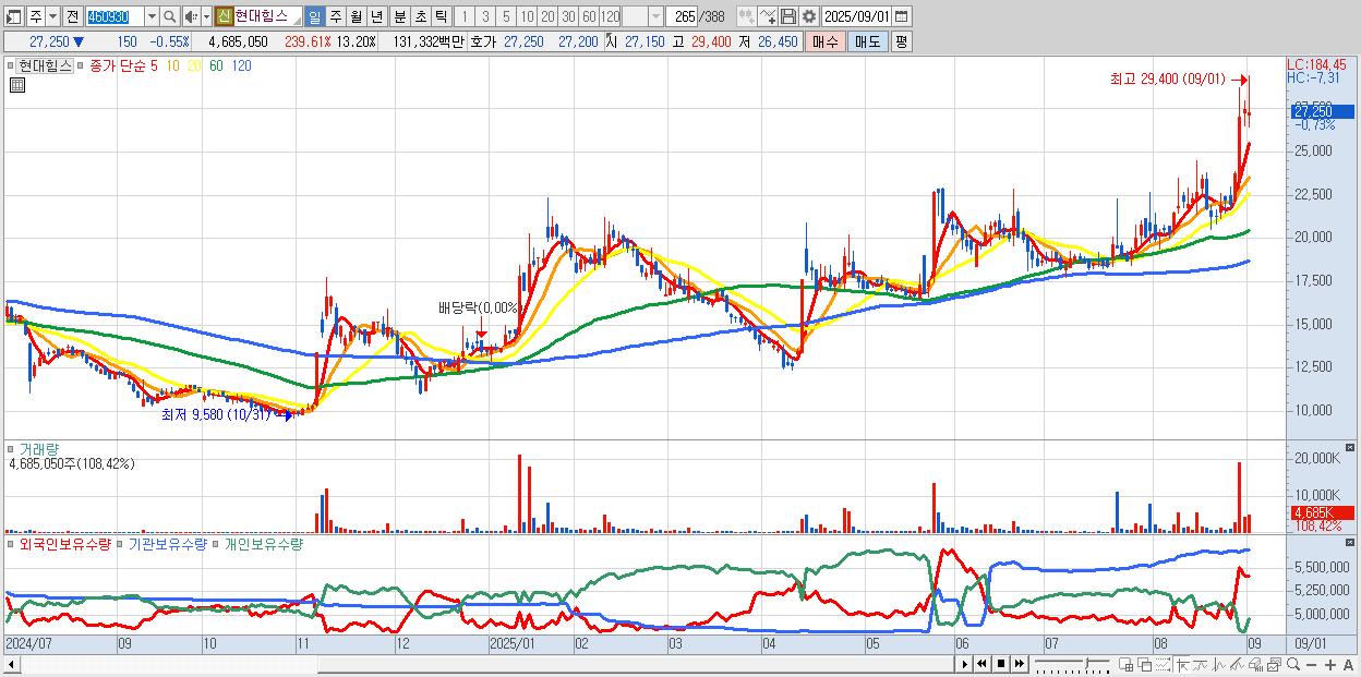 - 현대힘스 (27,250원 ▼ -0.55% , 시총: 9,668억, 거래량: 4,685,050, 거래대금:1,313억)