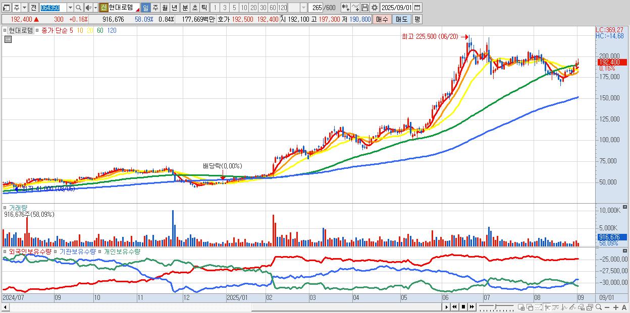 - 현대로템 (192,000원 ▼ -0.05% , 시총: 209,553억, 거래량: 644,094, 거래대금:1,248억)