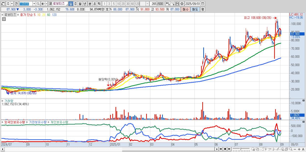 - 로보티즈 (87,900원 ▼ -3.3% , 시총: 11,621억, 거래량: 1,062,152, 거래대금:949억)