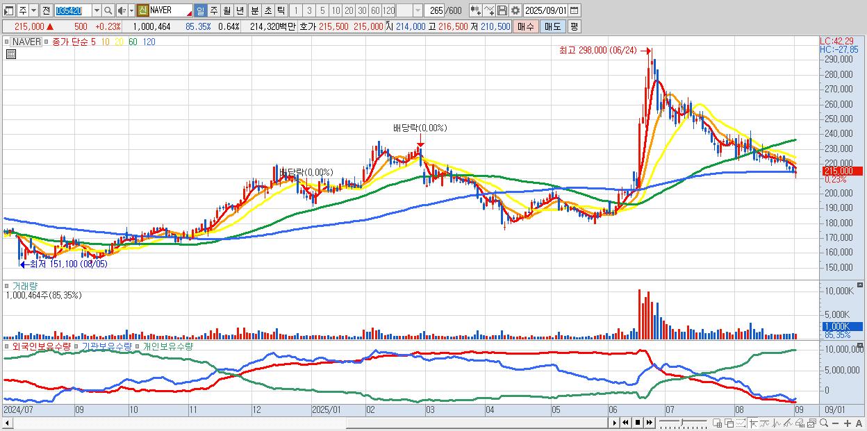 - NAVER (215,500원 ▲ 0.47% , 시총: 338,017억, 거래량: 634,984, 거래대금:1,361억)