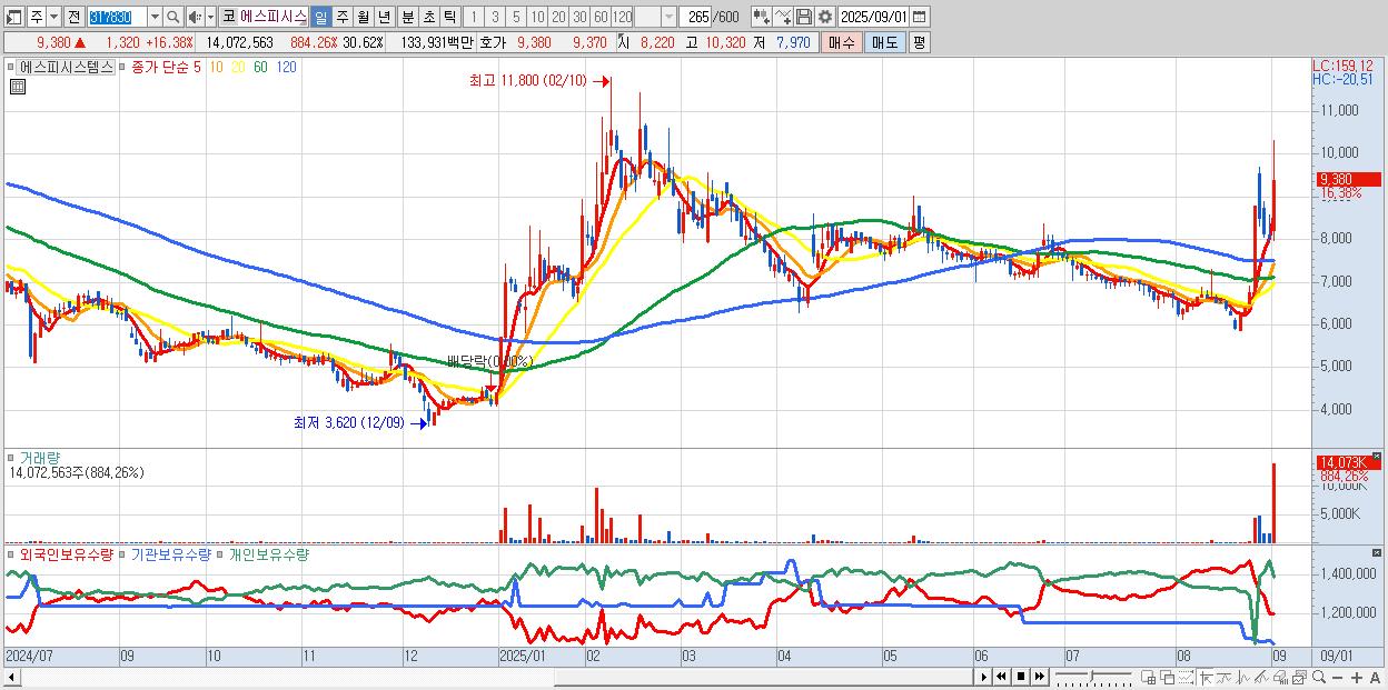 - 에스피시스템스 (9,380원 ▲ 16.38% , 시총: 1,011억, 거래량: 14,072,563, 거래대금:1,339억)