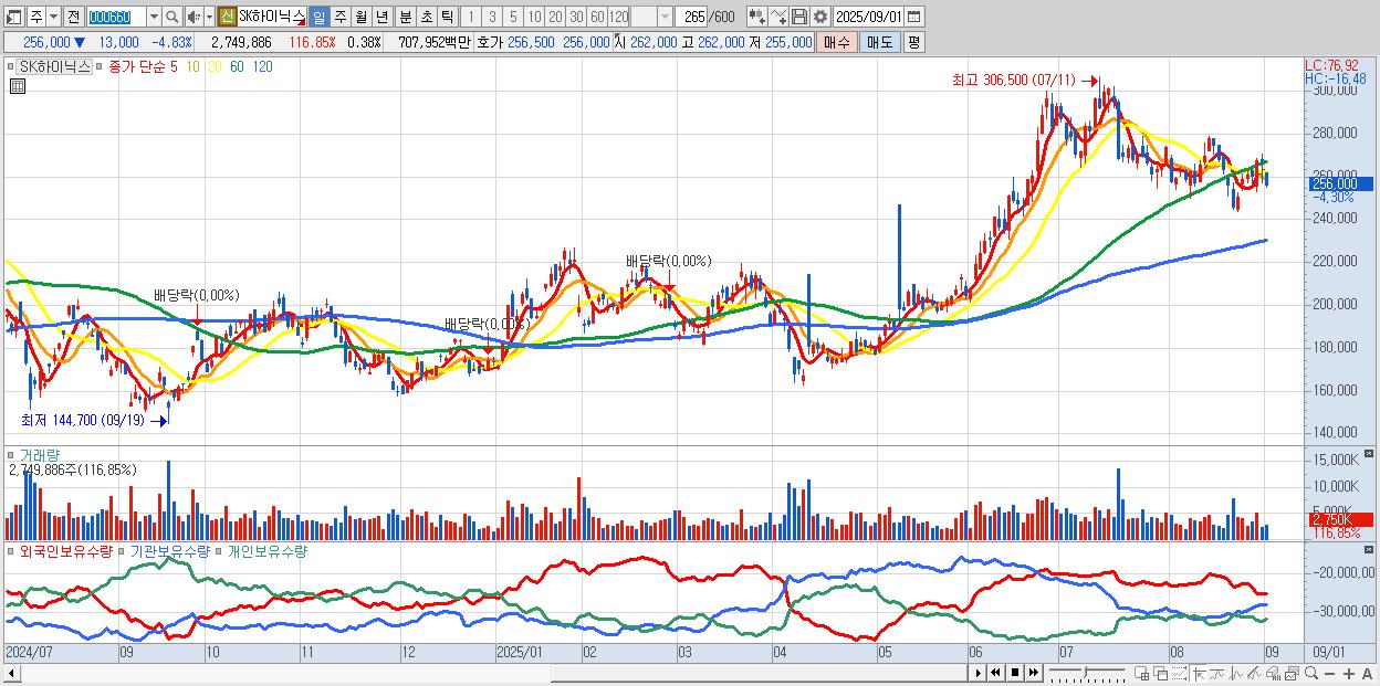 - SK하이닉스 (256,000원 ▼ -4.83% , 시총: 1,863,686억, 거래량: 1,837,054, 거래대금:4,727억)