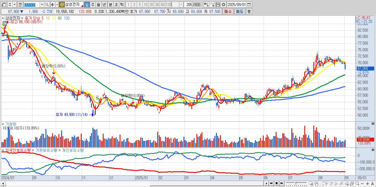 1.삼성전자 67,600원 ▼ -3.01% (KOSPI, 005930)
