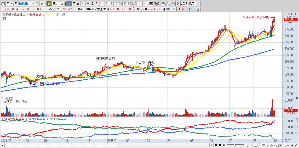 - HD한국조선해양 (415,000원 ▲ 2.09% , 시총: 293,708억, 거래량: 541,160, 거래대금:2,256억)