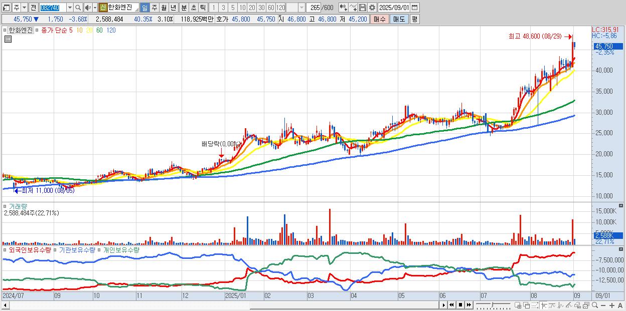 - 한화엔진 (45,750원 ▼ -3.68% , 시총: 38,177억, 거래량: 2,588,484, 거래대금:1,189억)