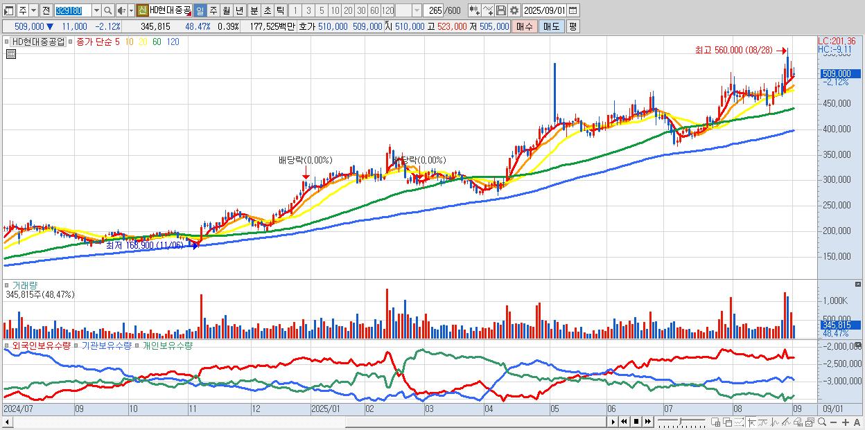 - HD현대중공업 (510,000원 ▼ -1.92% , 시총: 452,743억, 거래량: 223,878, 거래대금:1,149억)