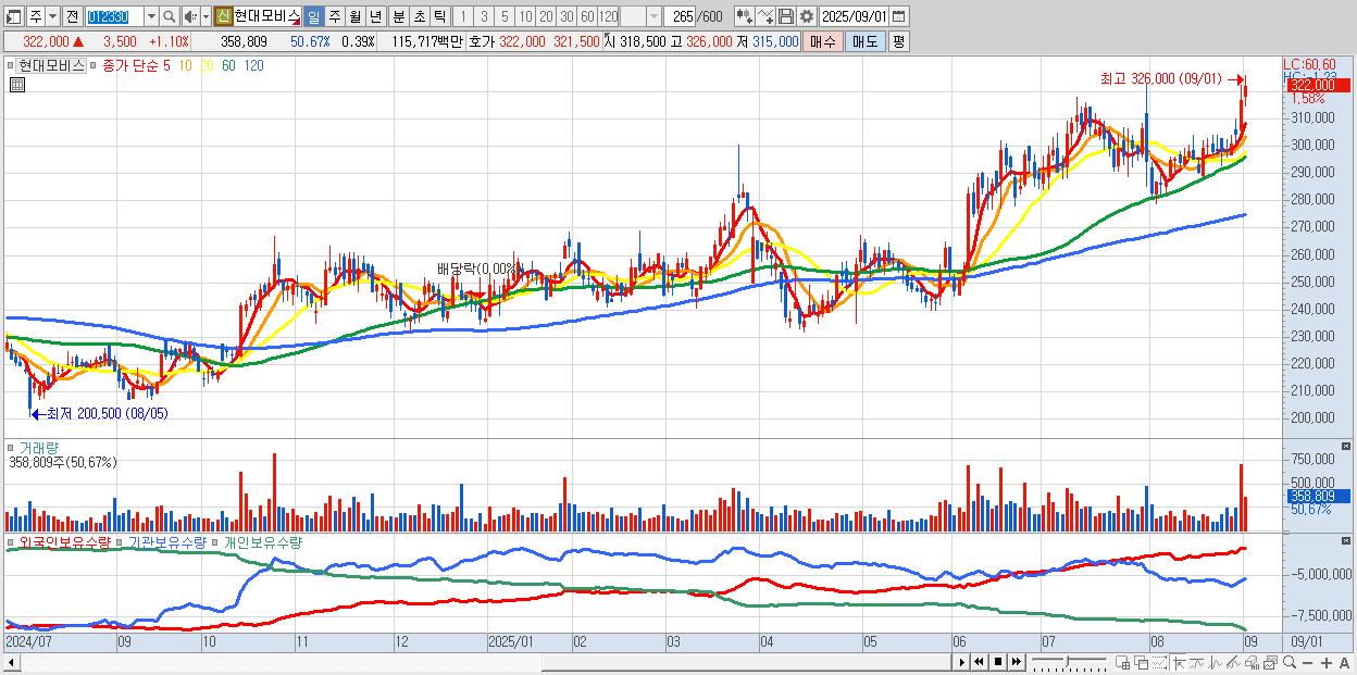 - 현대모비스 (321,500원 ▲ 0.94% , 시총: 295,121억, 거래량: 268,038, 거래대금:865억)