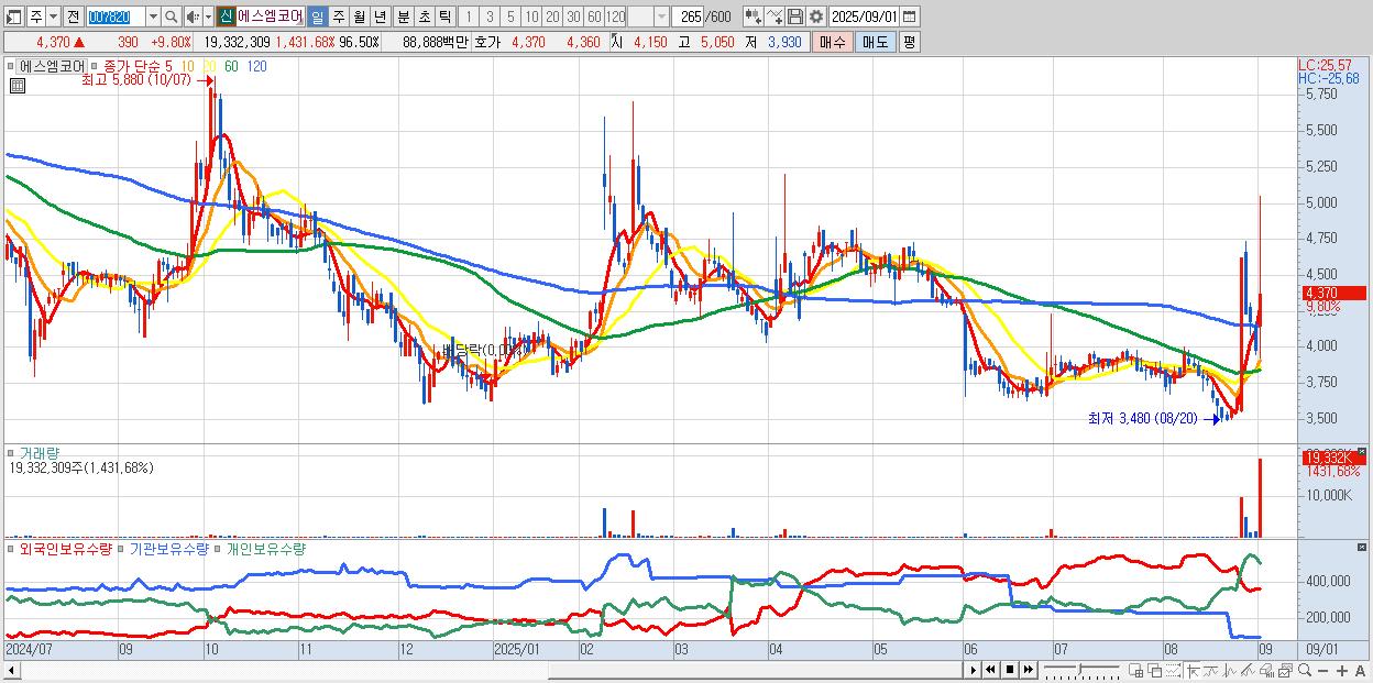 - 에스엠코어 (4,370원 ▲ 9.8% , 시총: 875억, 거래량: 19,332,309, 거래대금:889억)