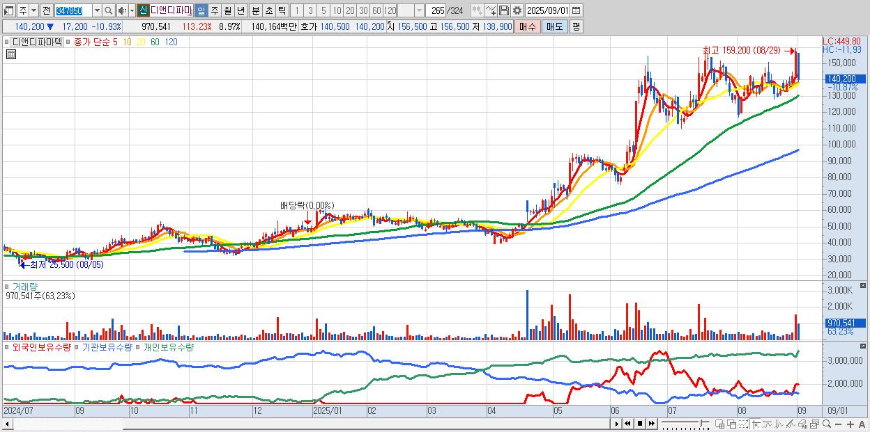- 디앤디파마텍 (140,200원 ▼ -10.93% , 시총: 15,171억, 거래량: 970,541, 거래대금:1,402억)